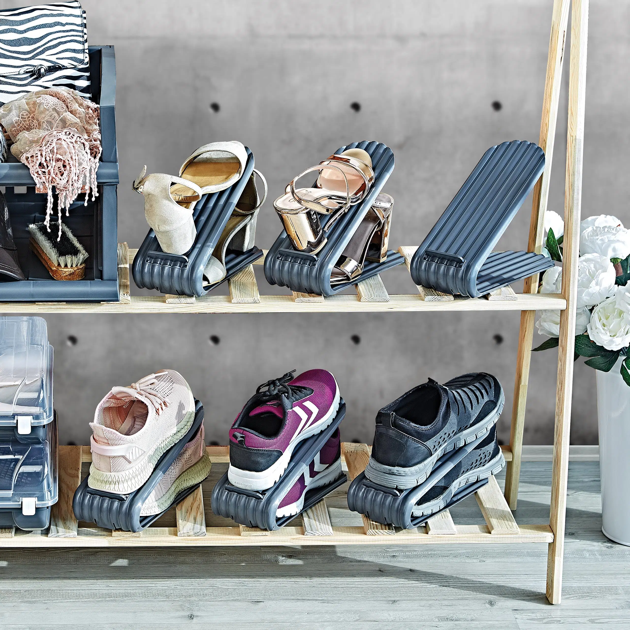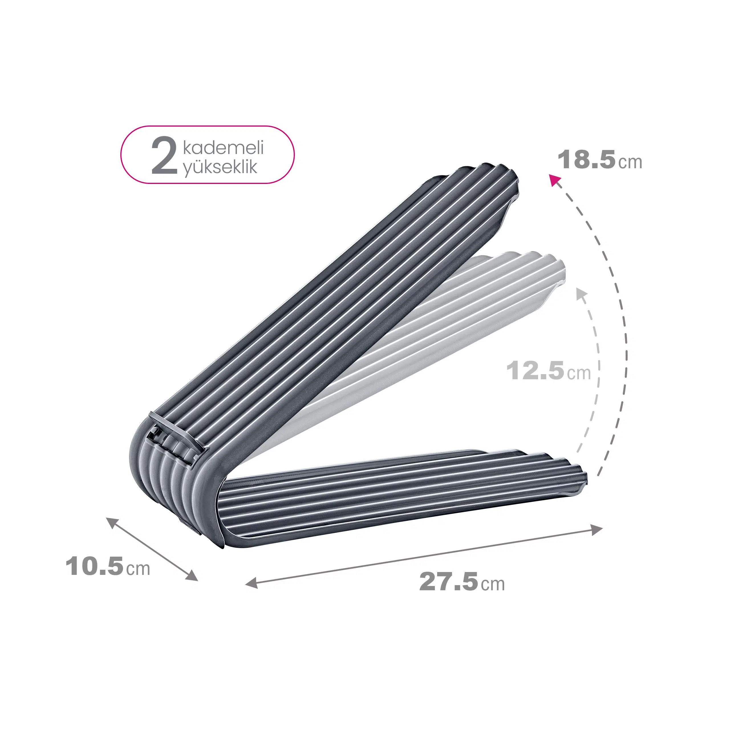 Clamp Ayarlanabilir Ayakkabı Rampası, evde ayakkabı düzeni sağlamak için ideal bir çözümdür. Polipropilen plastik malzemeden üretilen bu düzenleyiciler, sağlığa zararsız olup koku yapmayan özelliğiyle ayakkabı dolaplarınızı ferah tutar. 105 x 275 x 185 mm ölçülerinde olan bu rampalar, ayakkabı yüksekliğine göre kademeli olarak ayarlanabilir ve kısa bot, topuklu ayakkabı, klasik ayakkabı veya spor ayakkabı gibi farklı türler için kullanıma uygundur. Clamp düzenleyici, ayakkabılarınızı düzenli ve erişilebilir bir şekilde saklamanızı sağlarken dolabınızda %50'ye varan yer tasarrufu sunar. Ayakkabı düzenine önem veren herkes için pratik ve işlevsel bir çözüm sunar.